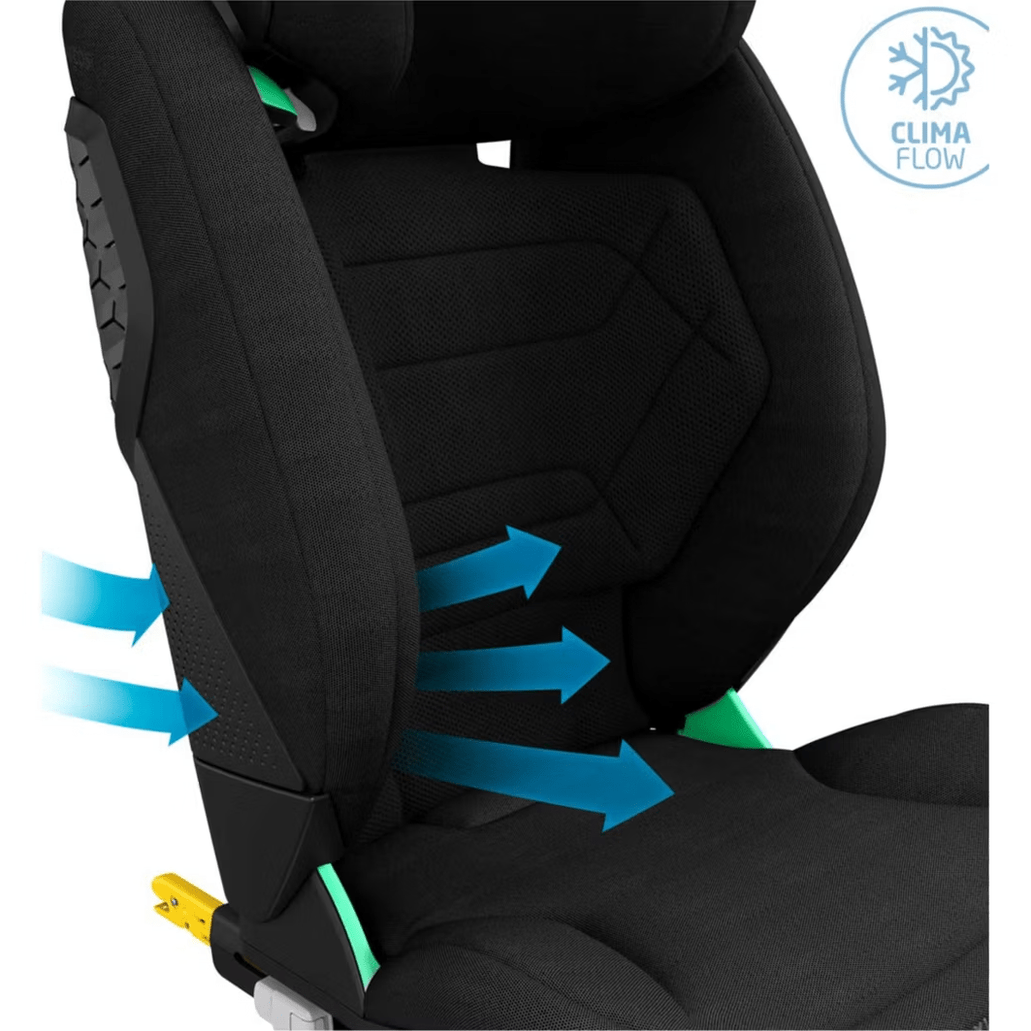 For comfort, ClimaFlow ventilation panels and breathable fabrics help regulate temperature, keeping your child cool throughout every journey. The seat installs securely using ISOFIX, while the open design and easy buckle system make daily use simple for both parent and child. EcoCare fabrics, made from 100% recycled materials, are removable and machine washable, ensuring easy upkeep.