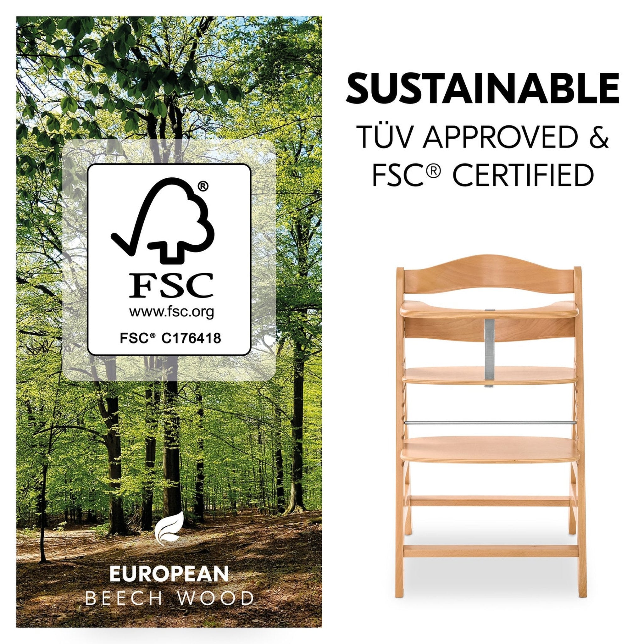 The Alpha+ Wooden Highchair adapts perfectly as your child develops. With 8 adjustable height positions for the seat and footrest, it ensures a comfortable sitting position at every stage — from toddler to teenager and even adulthood. Crafted from FSC®-certified beechwood, it’s durable, stable, and built to last for generations.