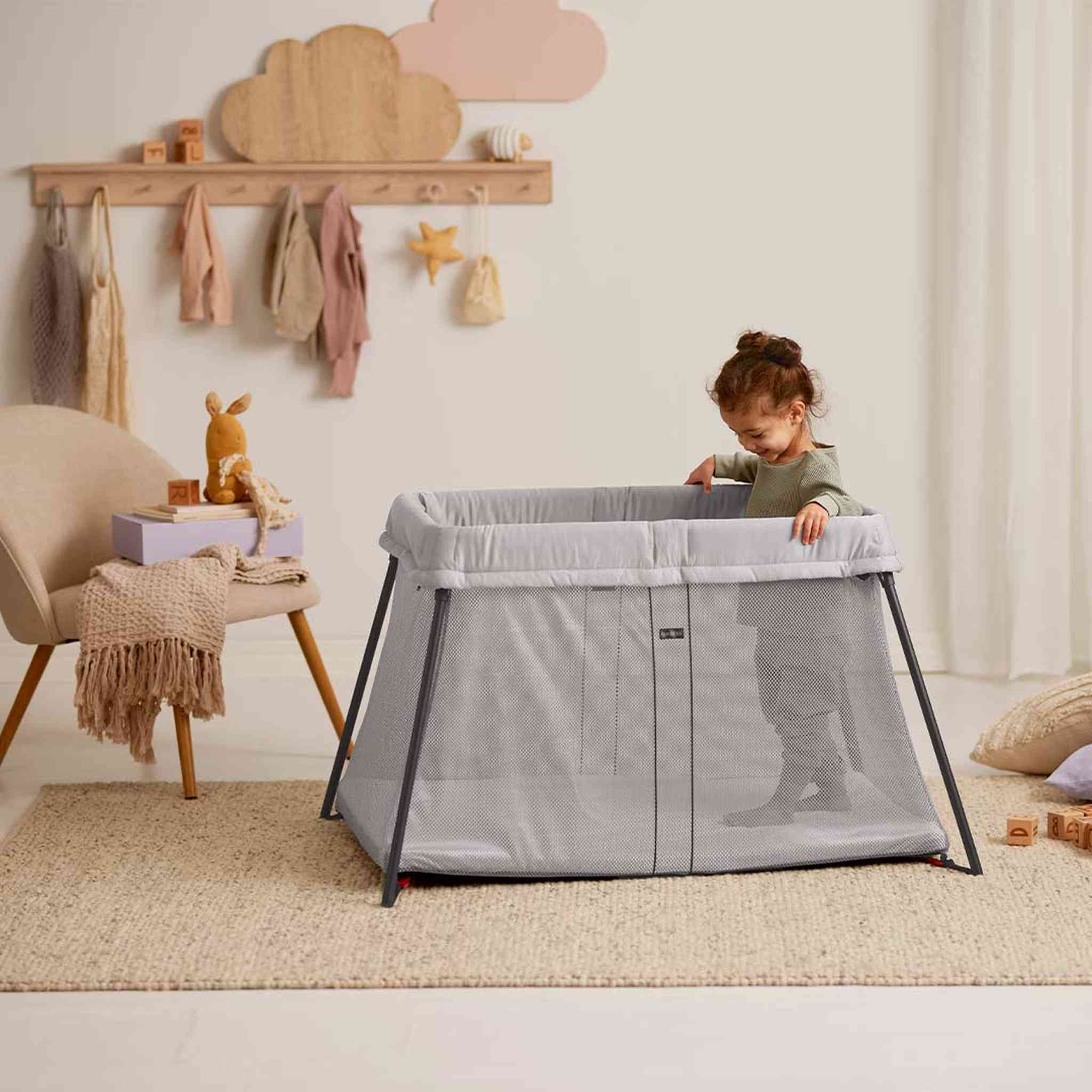 The BabyBjörn Travel Cot Light in Silver makes travelling with your baby or toddler simple and stress-free. Lightweight, compact, and easy to carry, it sets up in one quick movement with no loose parts. The cot stands firmly on the floor, while the soft mattress provides a safe and cosy sleep environment whether you’re at home, visiting family, or on holiday.